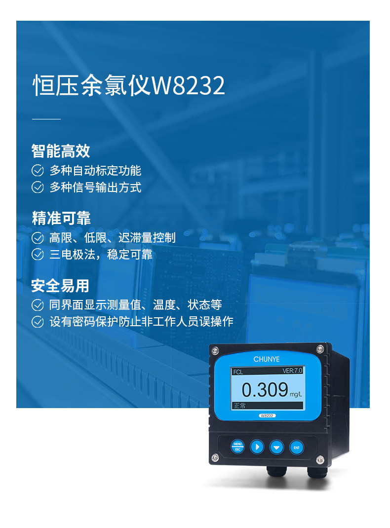 W8232 在线余氯仪 工业在线余氯仪是带微处理器的水质在线监测控制仪。广泛用于饮用水处理厂、饮用水分布网、游泳池、水质处理工程、污水处理、水质消毒等各个行业过程,对水溶液中的余氯值及温度值进行连续监测和控制。