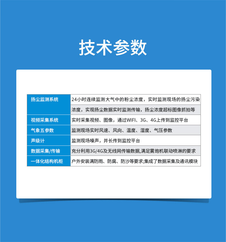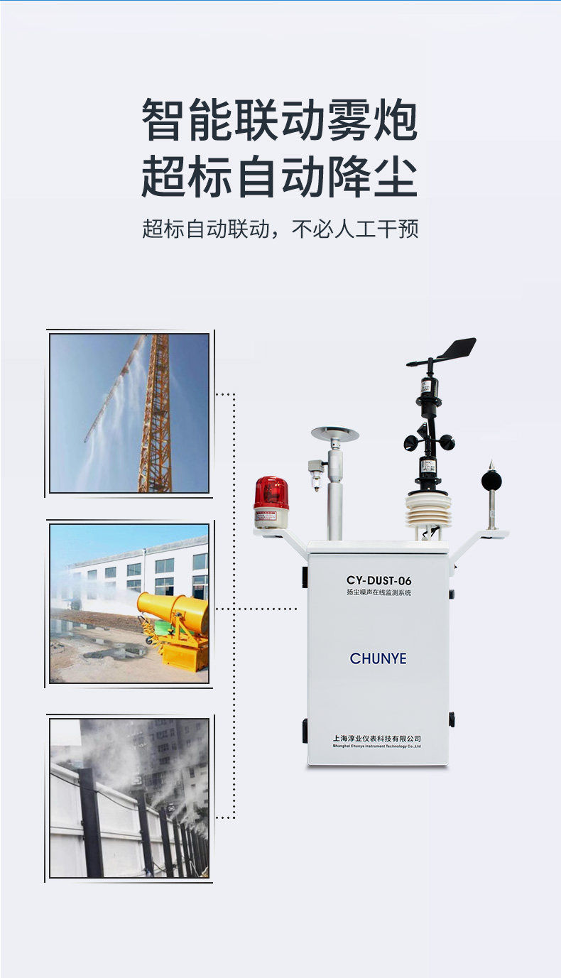 CY-DUST06型扬尘噪声在线监测系统是一款符合JJG846-2015粉尘浓度测量仪;HJ653-2013环境空气颗粒物(PM10和PM2.5)连续自动监测系统技术要求及检测方法;GB/T 3758.1-2010电声学、声级计,**部分:规范;GB/T 4208-2017外壳防护等级(IP代码),同时支持有线、无线模式传输的高性能、多功能、户外型专业级监测设备。系统由粉尘浓度连续监测仪、声级计、视频监控及气象设备组成,可以通过监测粉尘的浓度,实时监控扬尘排放情况;设定颗粒物浓度及噪声数据的报警值,实现报警抓拍,并向系统监控平台发送超标信息。实现对扬尘噪声的监控。