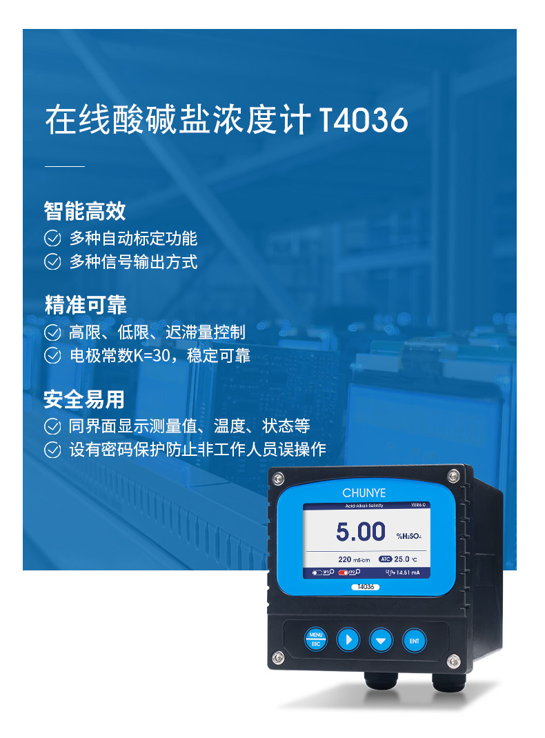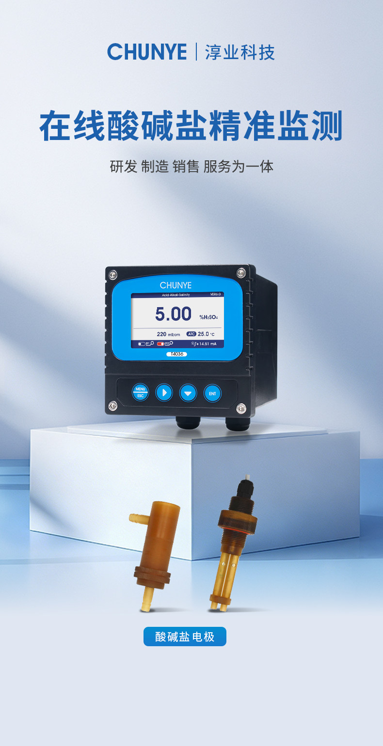 工业在线酸/碱/盐浓度在线监测控制仪是带微处理器的水质在线监测控制仪。该仪 表广泛用于火电、化工、钢铁酸洗等行业,如电厂对离子交换树脂的再生,化工化学工 业过程等,对水溶液中的化学酸或碱浓度进行连续检测和控制。