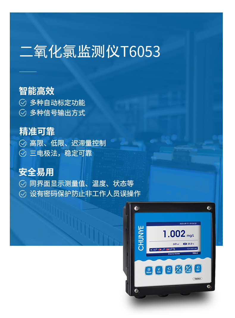 工业在线二氧化氯监测仪是带微处理器的水质在线监测控制仪。该仪表广泛用于饮 用水处理厂、饮用水分布网、游泳池、水质处理工程、污水处理、水质消毒等各个行业 过程,对水溶液中的二氧化氯值进行连续监测和控制。