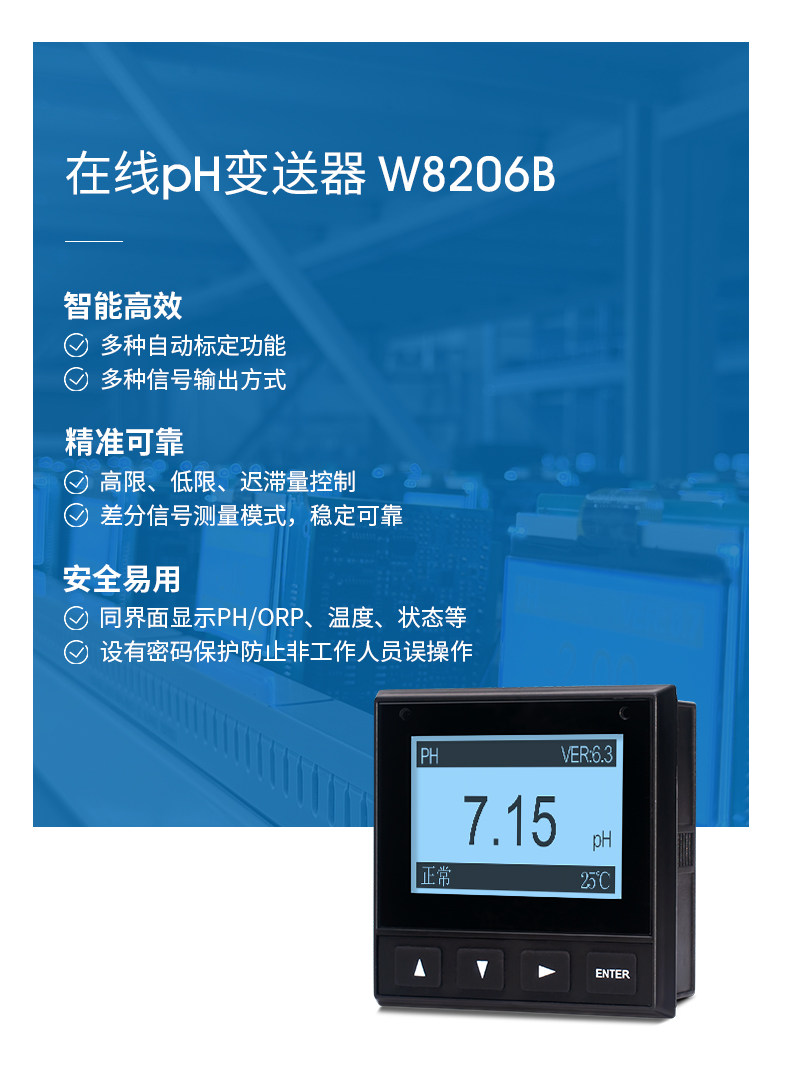 工业在线PH/ORP计是带微处理器的水质在线监测控制仪。该仪表配置不同类型的pH电极或ORP电极广泛用于电厂、石油化工、冶金电子、采矿业、造纸业、生物发酵工程、医药、食品饮料、环保水处理、水产养殖、现代农业种植等各个行业。对水溶液的pH(酸、 碱度)值、ORP(氧化、还原电位)值和温度值进行连续监测和控制。