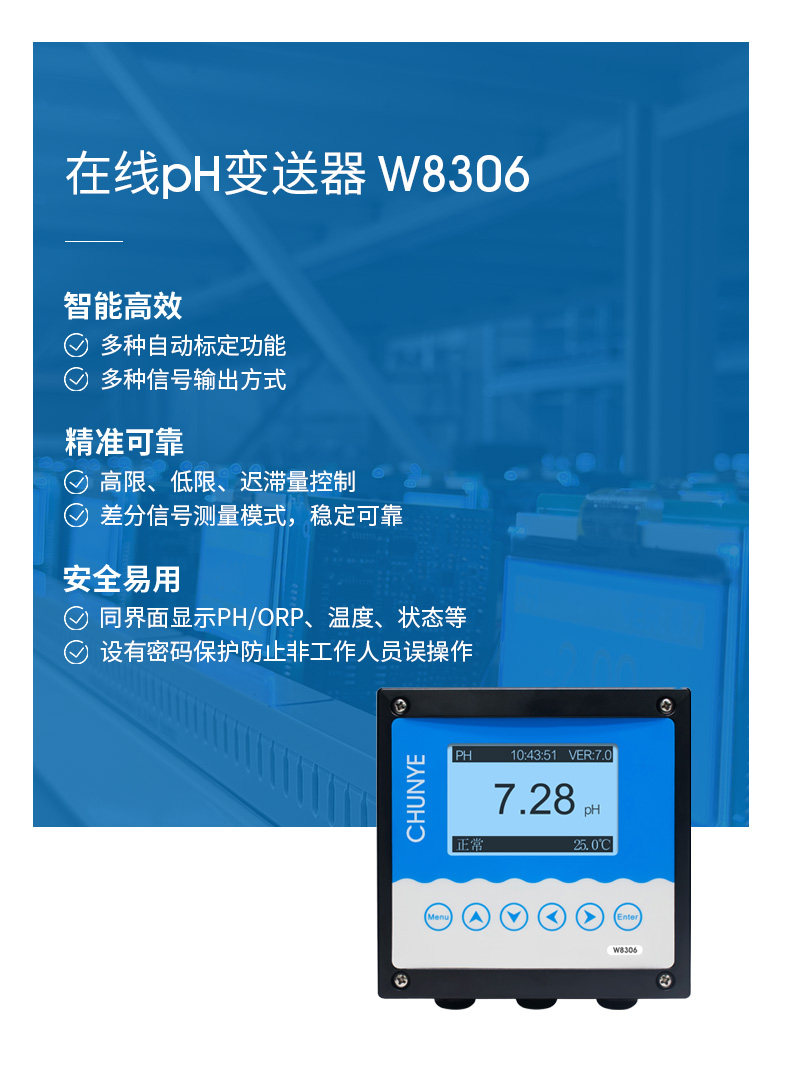 工业在线PH/ORP计是带微处理器的水质在线监测控制仪。该仪表配置不同类型的pH 电极或ORP电极广泛用于电厂、石油化工、冶金电子、采矿业、造纸业、生物发酵工程、医药、食品饮料、环保水处理、水产养殖、现代农业种植等各个行业。对水溶液的pH (酸、碱度)值、ORP(氧化、还原电位)值和温度值进行连续监测和控制。