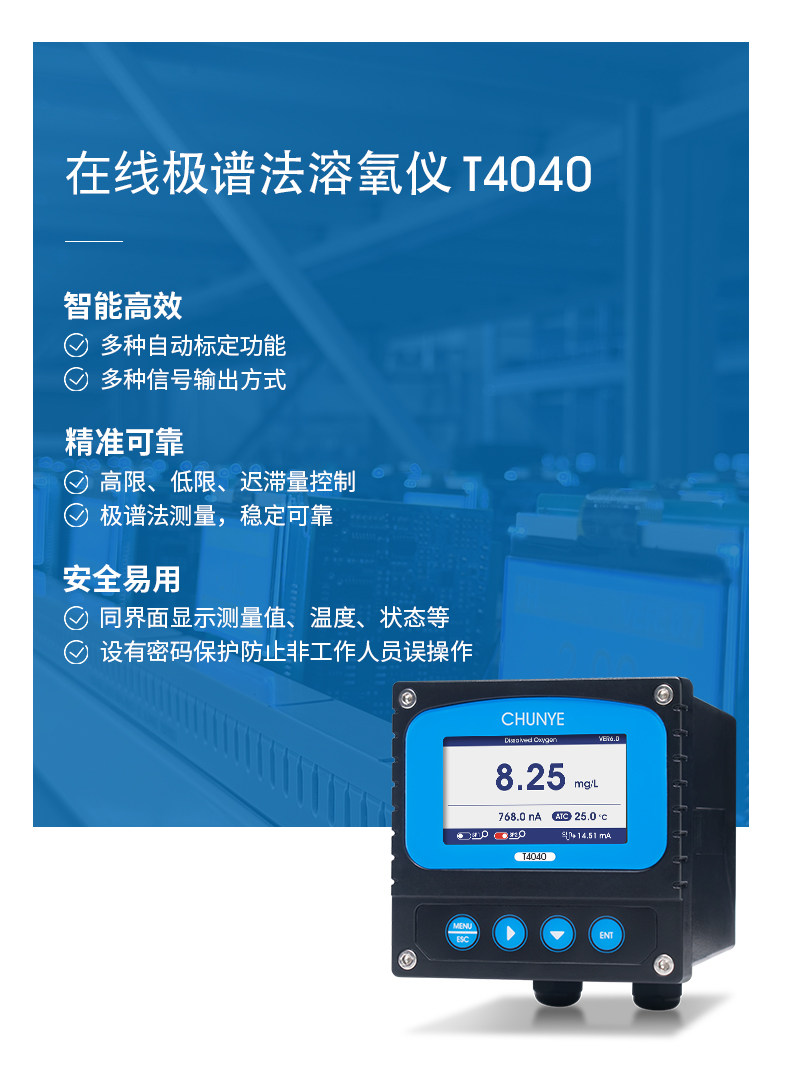T4040 在线溶氧仪 工业在线溶氧仪是带微处理器的水质在线监测控制仪。该仪表配置极谱法溶氧电极广泛用于电厂、石油化工、冶金电子、矿业、纸业、生物发酵、医药、食品饮料、环保水处理、水产养殖等各个行业;对水溶液的溶解氧值和温度值进行连续监测和控制。