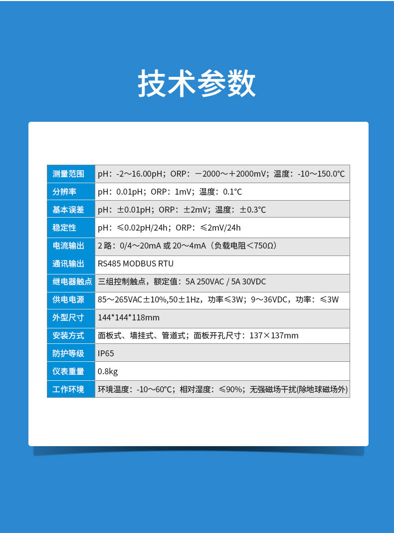 该仪表配置不同类型的pH电极或ORP电极广泛用于电厂、石油化工、冶金电子、采矿业、造纸业、生物发酵工程、医药、食品饮料、环保水处理、水产养殖、现代农业种植等各个行业。对水溶液的pH(酸碱度)值、ORP(氧化还原电位)值和温度值进行连续监测和控制。