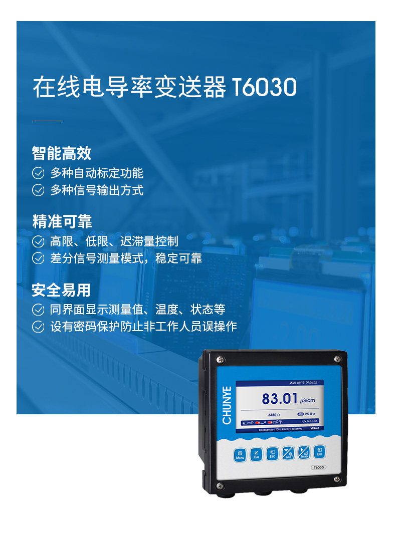 工业在线电导率仪是带微处理器的水质在线监测控制仪。该仪表配置不同常数的电导电极广泛用于电厂、石油化工、冶金电子、矿业、纸业、半导体、医药、食品饮料、环保水处理、新型农业种植等各个行业;适用于软化水、原水、蒸汽冷凝水、海水蒸馏以及去离子水等;对水溶液的电导率、盐度、TDS和温度值进行连续监测和控制。