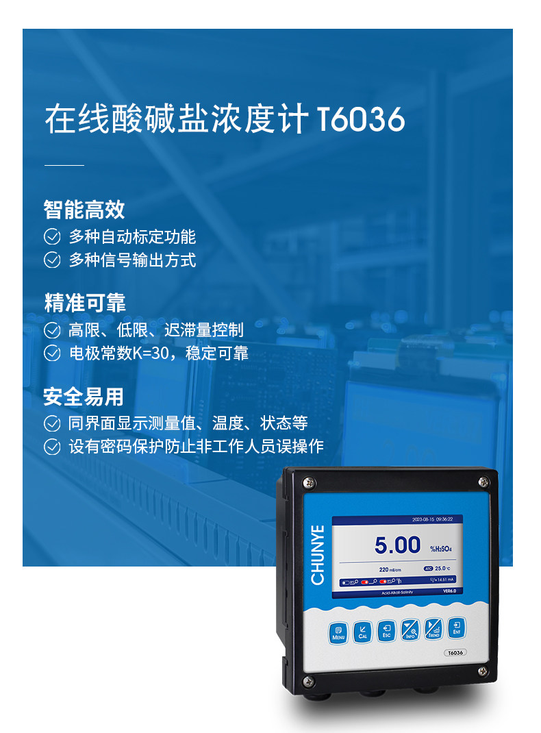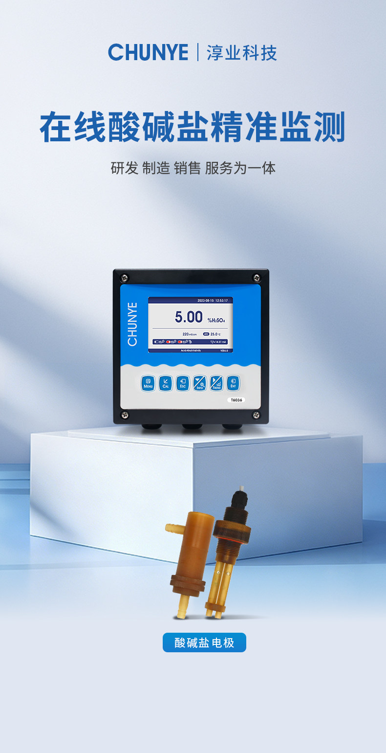 工业在线酸/碱/盐浓度在线监测控制仪是带微处理器的水质在线监测控制仪。该仪表广泛用于火电、化工、钢铁酸洗等行业,如电厂对离子交换树脂的再生,化工化学工业过程等,对水溶液中的化学酸或碱浓度进行连续检测和控制。