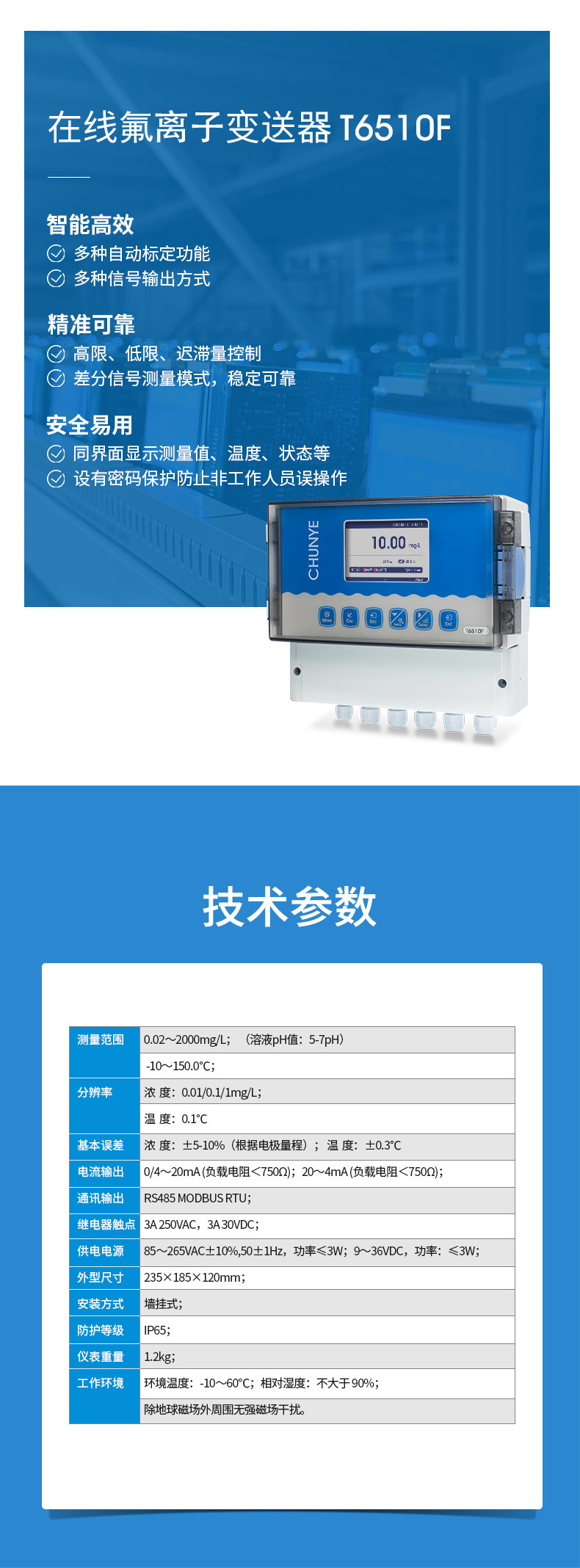 T6510F型氟离子监测仪 工业在线离子监测仪是带微处理器的水质在线监测控制仪。该仪表配置不同类型的离子电极广泛用于电厂、石油化工、冶金电子、采矿业、造纸业、生物发酵工程、医药、食品饮料、环保水处理。对水溶液的离子浓度值进行连续监测和控制。