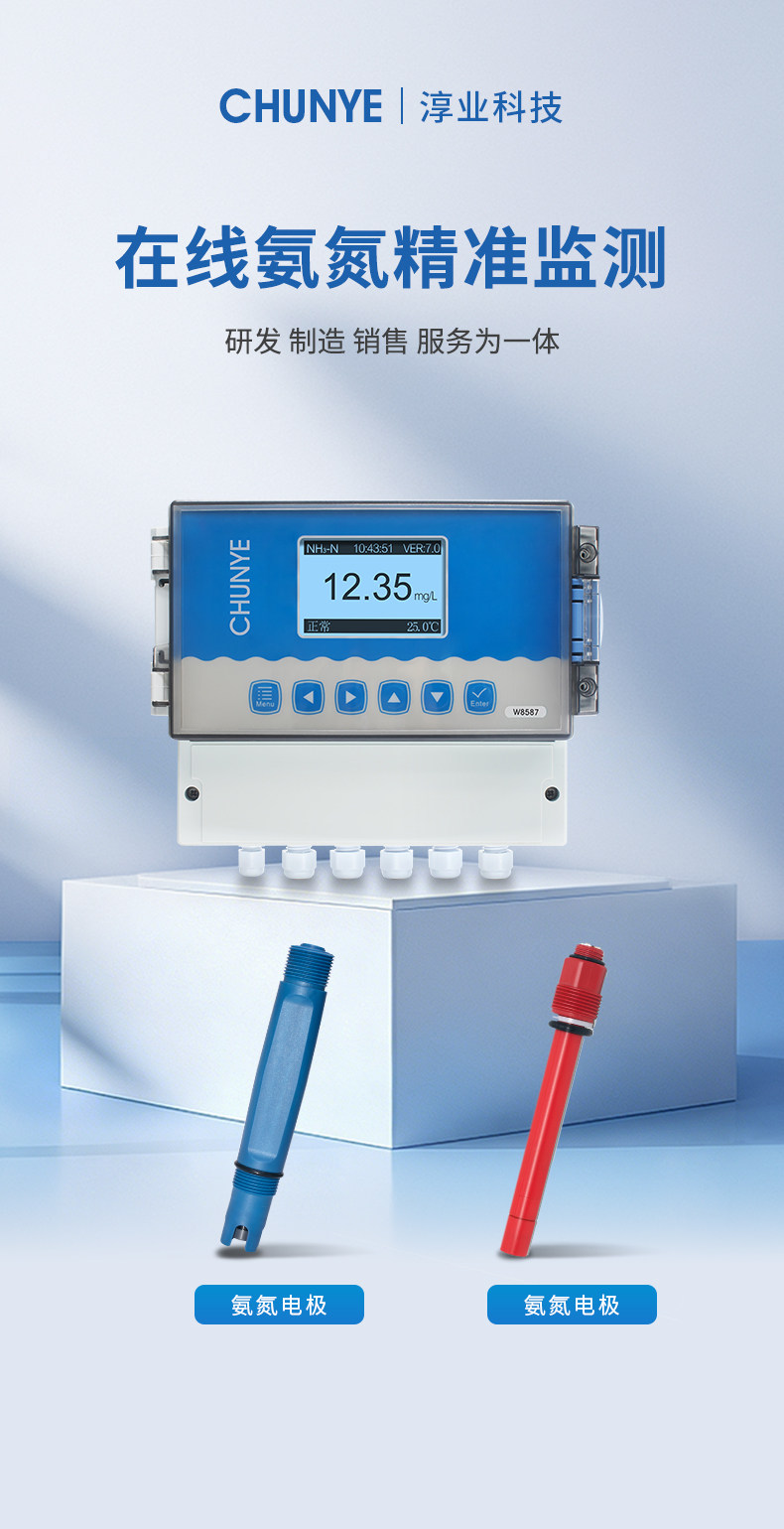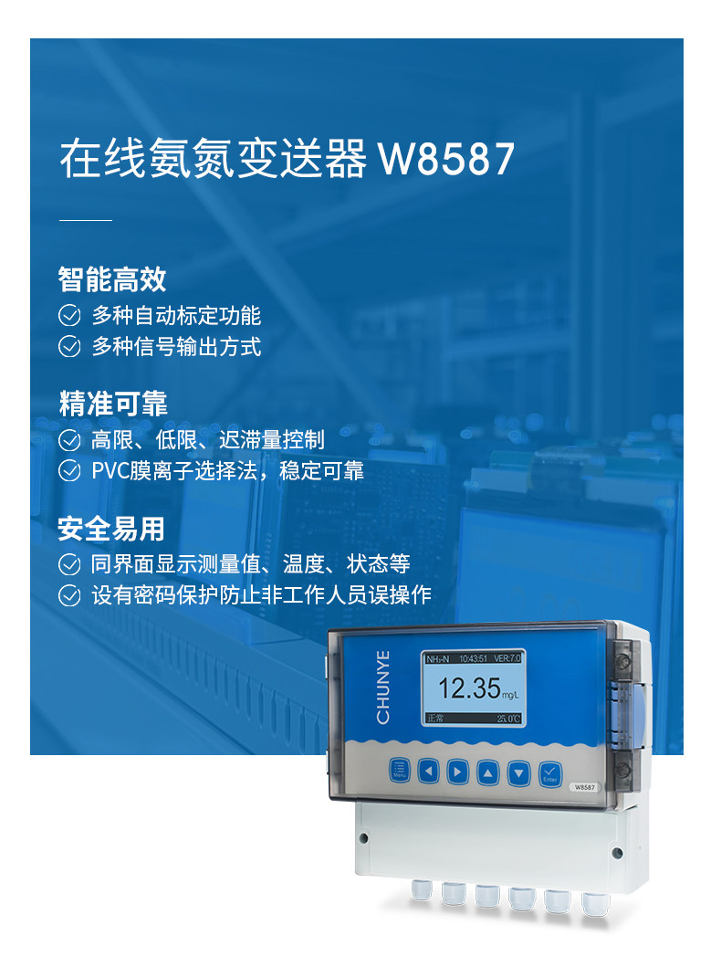 W8587 氨氮监测仪 工业在线氨氮监测仪是带微处理器的水质在线监测控制仪。该仪表配置不同类型的离子电极广泛用于电厂、石油化工、冶金电子、采矿业、造纸业、生物发酵工程、医药、食品饮料、环保水处理。对水溶液的离子浓度值进行连续监测和控制。