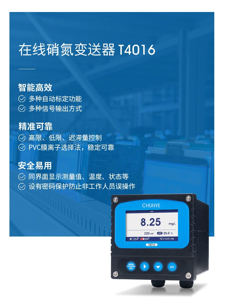 T4016 硝氮监测仪 工业在线硝氮监测仪是带微处理器的水质在线监测控制仪。该仪表配置不同类型的离子电极广泛用于电厂、石油化工、冶金电子、采矿业、造纸业、生物发酵工程、医药、食品饮料、环保水处理。对水溶液的离子浓度值进行连续监测和控制。