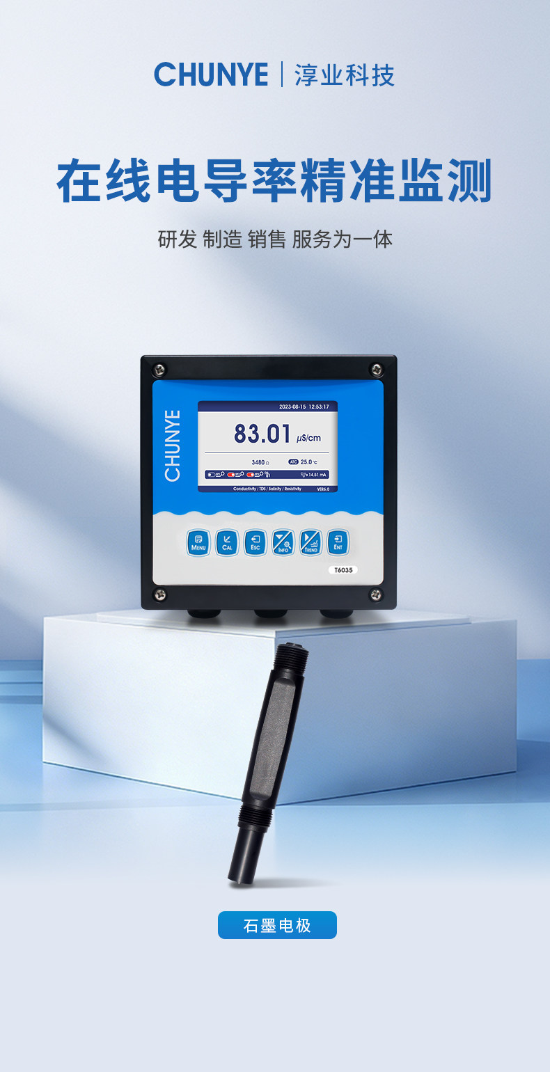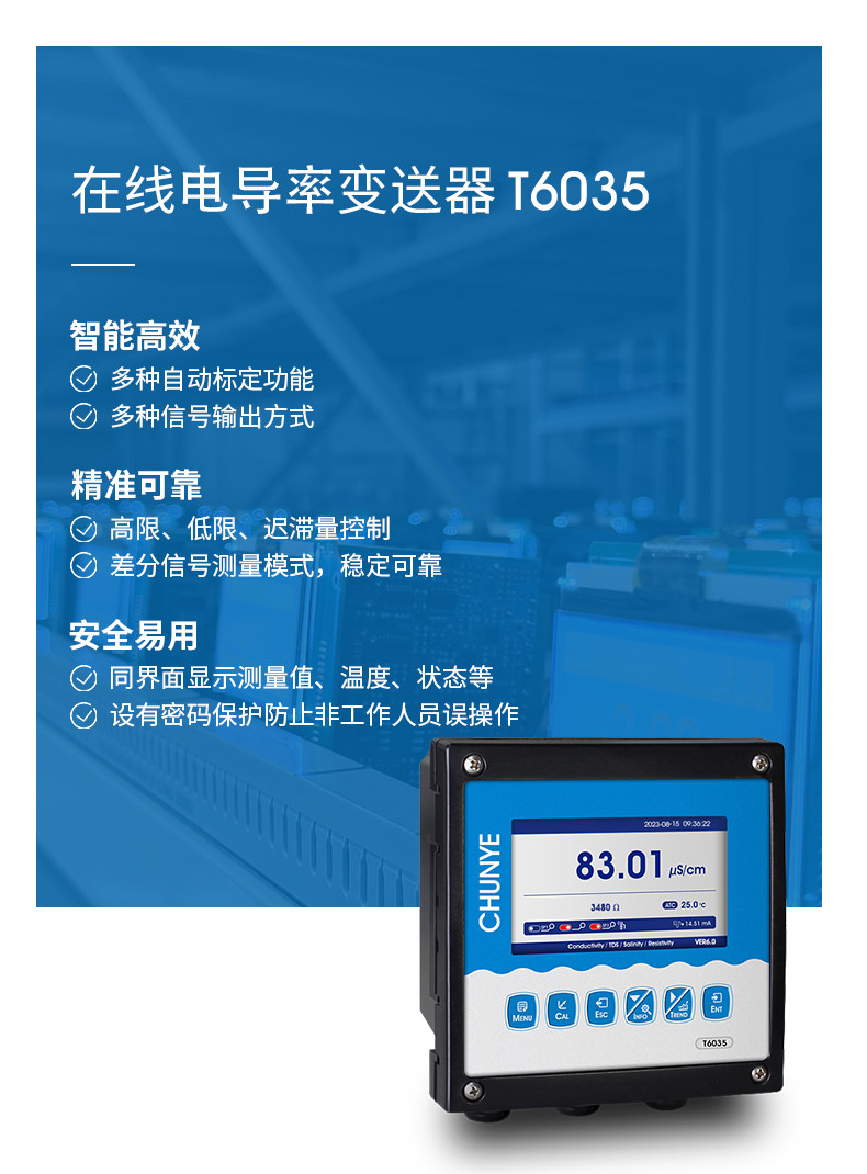 T6035 在线电导率仪 (TDS/盐度) 工业在线电导率仪是带微处理器的水质在线监测控制仪。该仪表广泛用于电厂、石油化工、冶金电子、矿业、纸业、半导体、医药、食品饮料、环保水处理、新型农业种植等各个行业;适用于软化水、原水、蒸汽冷凝水、海水蒸馏以及去离子水等;对水溶液的电导率值、电阻率值、TDS值、盐度和温度值进行连续监测和控制。
