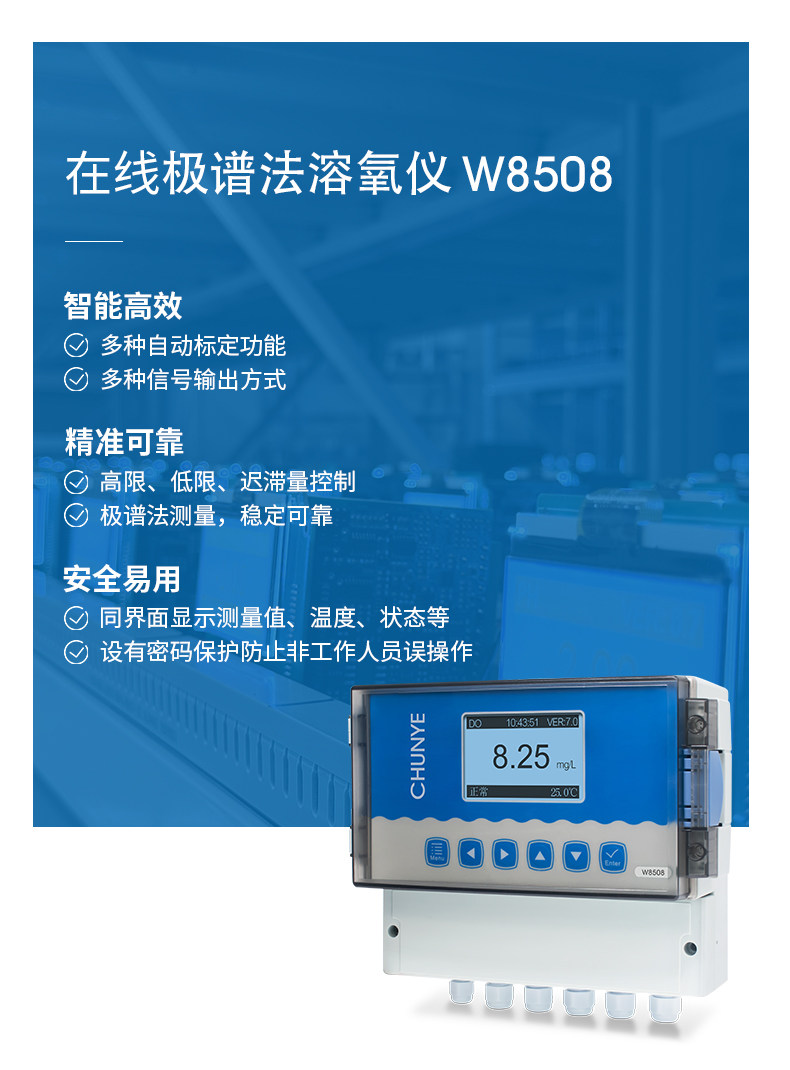 W8508 在线溶氧仪 工业在线溶氧仪是带微处理器的水质在线监测控制仪。该仪表配置极谱法溶氧电极广泛用于电厂、石油化工、冶金电子、矿业、纸业、生物发酵、医药、食品饮料、环保水处理、水产养殖等各个行业;对水溶液的溶解氧值和温度值进行连续监测和控制。