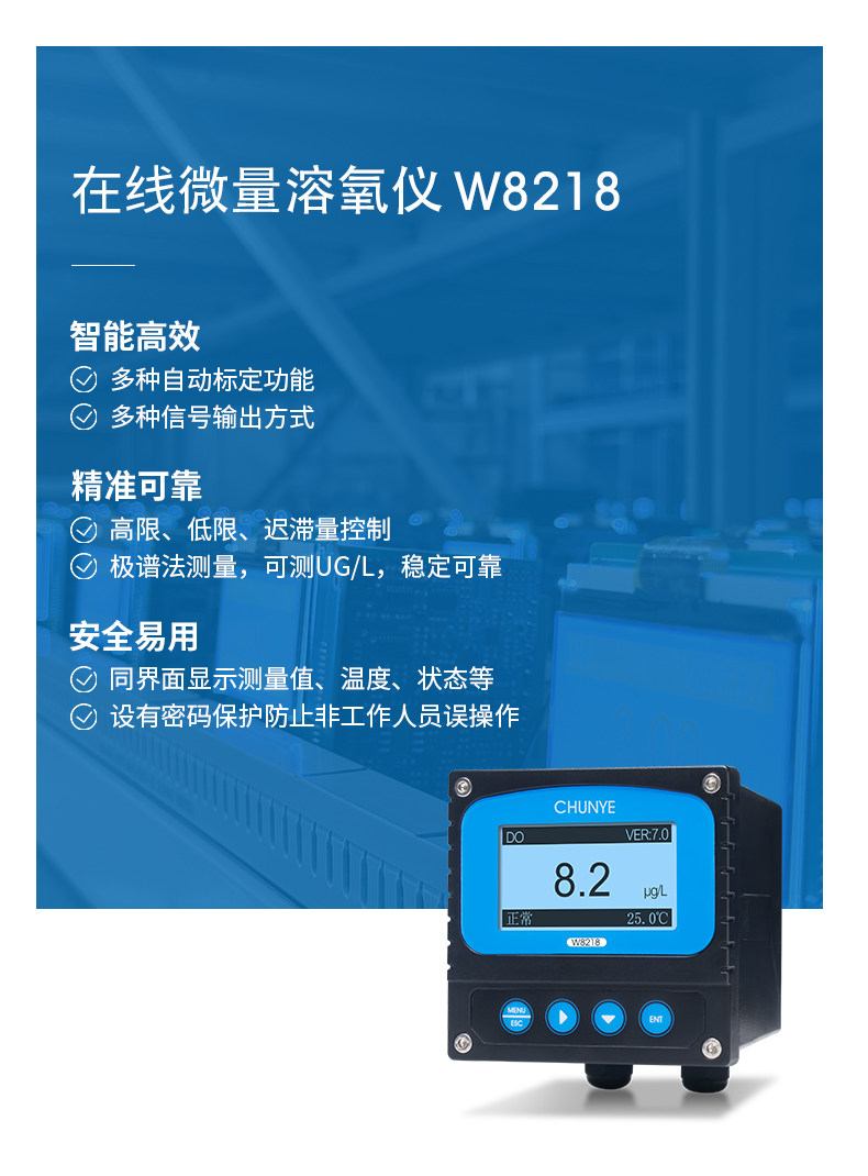 W8218 在线溶氧仪 工业在线溶氧仪是带微处理器的水质在线监测控制仪。该仪表配置极谱法溶氧电极广泛用于电厂、石油化工、冶金电子、矿业、纸业、生物发酵、医药、食品饮料、环保水处理、水产养殖等各个行业;对水溶液的溶解氧值和温度值进行连续监测和控制。