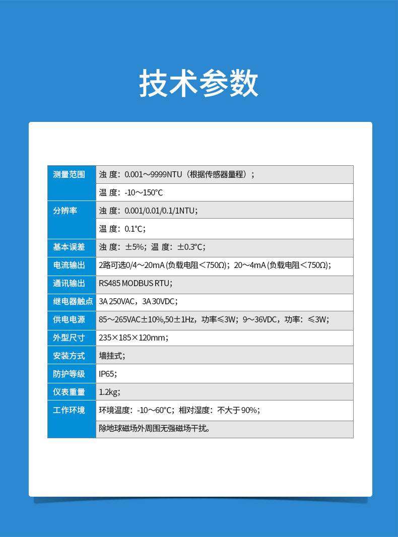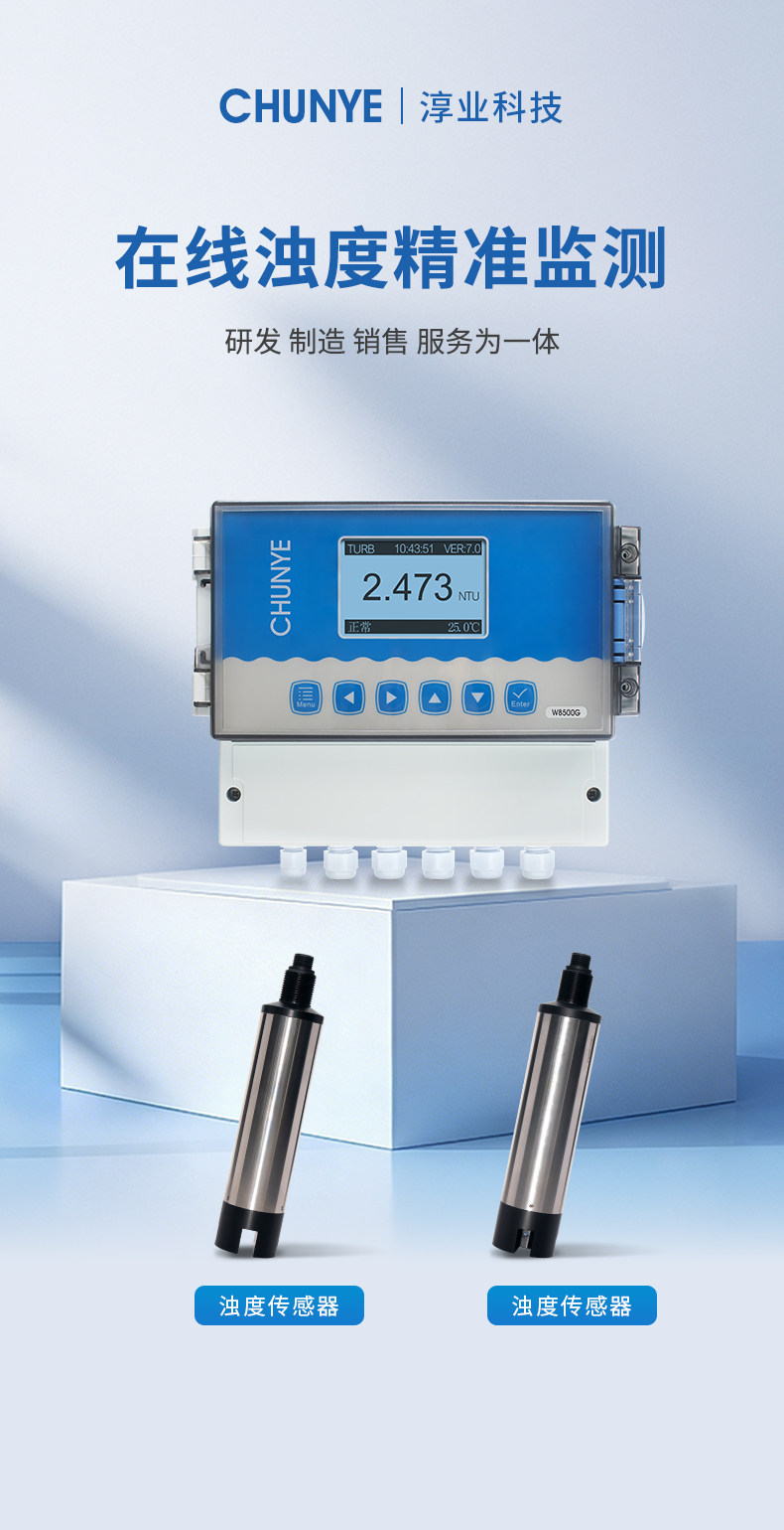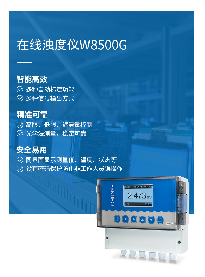 W8500G 在线浊度仪 典型应用 自来水厂出厂水的浊度监测;市政管网水质监测; 工业过程水质监测,循环冷却水、活性碳过滤器出水、膜过滤出水等。