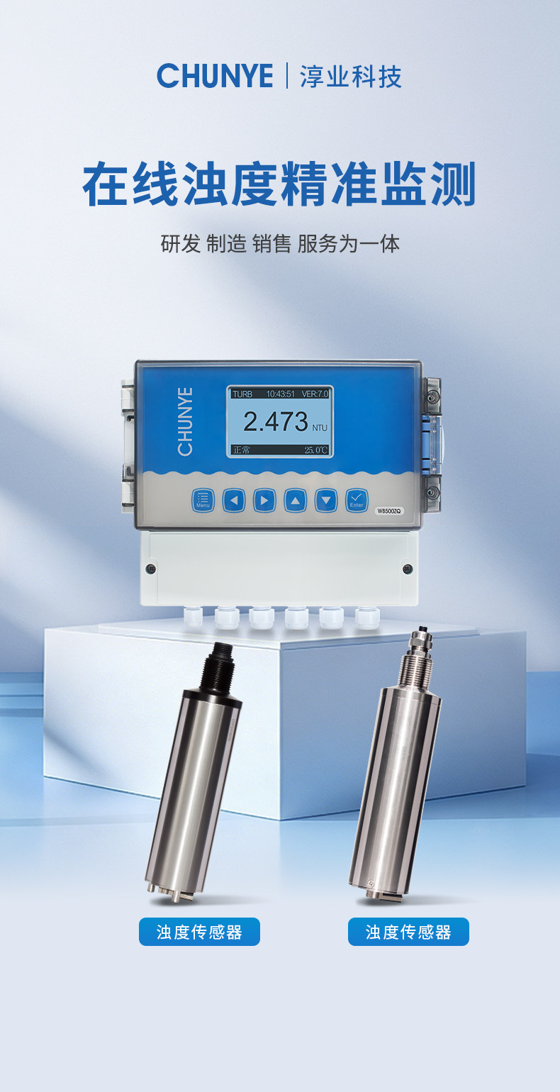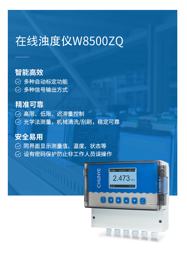 W8500ZQ 在线浊度仪 典型应用 自来水厂出厂水的浊度监测;市政管网水质监测; 工业过程水质监测,循环冷却水、活性碳过滤器出水、膜过滤出水等。