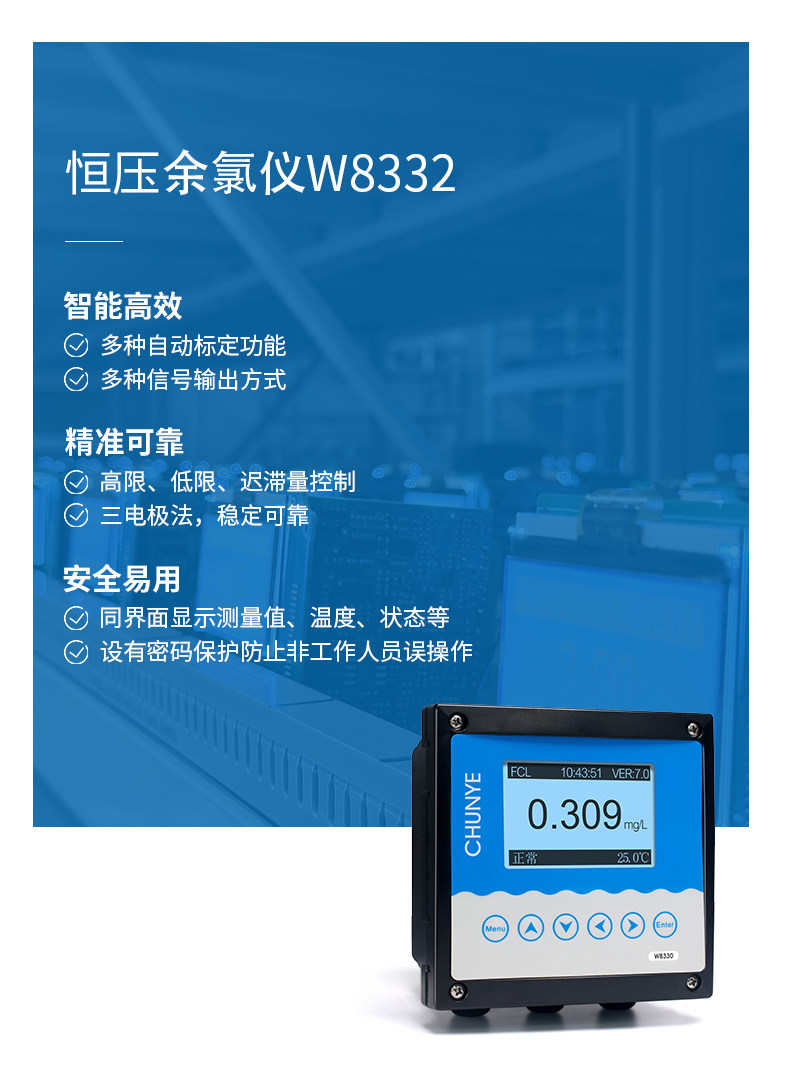 W8332 在线余氯仪 工业在线余氯仪是带微处理器的水质在线监测控制仪。广泛用于饮用水处理厂、饮用水分布网、游泳池、水质处理工程、污水处理、水质消毒等各个行业过程,对水溶液中的余氯值及温度值进行连续监测和控制。