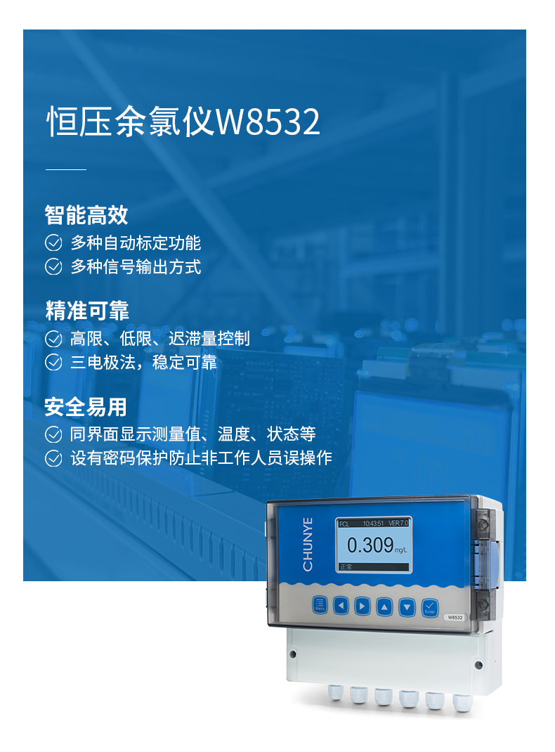 W8532 在线余氯仪 工业在线余氯仪是带微处理器的水质在线监测控制仪。该仪表广泛用于饮用水处理厂、饮用水分布网、游泳池、水质处理工程、污水处理、水质消毒等各个行业过程,对水溶液中的余氯值进行连续监测和控制。