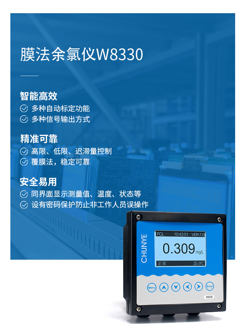 W8330 在线余氯仪 工业在线余氯仪是带微处理器的水质在线监测控制仪。广泛用于饮用水处理厂、饮用水分布网、游泳池、水质处理工程、污水处理、水质消毒等各个行业过程,对水溶液中的余氯值、pH值及温度值进行连续监测和控制。