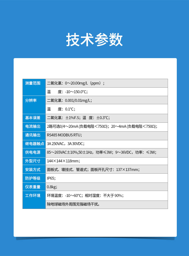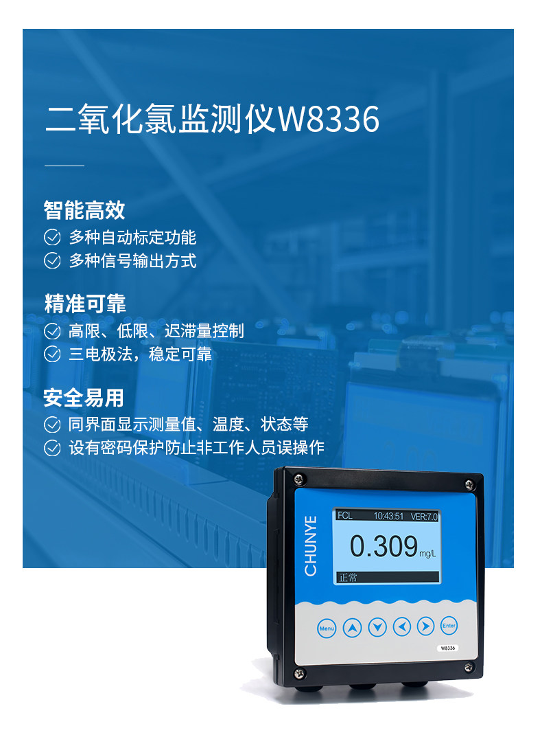 W8336 二氧化氯监测仪 是带微处理器的水质在线监测控制仪。该仪表广泛用于饮用水处理厂、饮用水分布网、游泳池、水质处 理工程、污水处理、水质等各个行业过程,对水溶液中的二氧化氯值进行连续监测和控制。