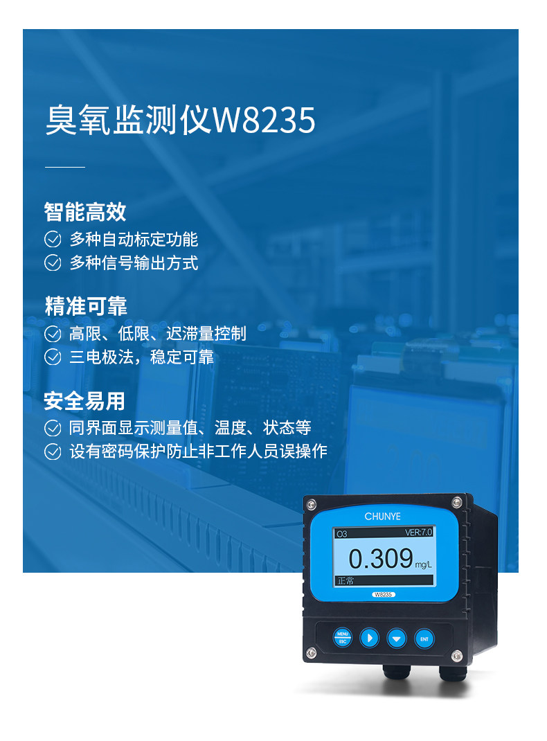 W8235 臭氧监测仪 工业在线臭氧监测仪是带微处理器的水质在线监测控制仪。该仪表广泛用于饮用水处理厂、饮用水分布网、游泳池、水质处理工程、污水处理、水质消毒(臭氧发生器配套)等各个行业过程,对水溶液中的臭氧值进行连续监测和控制。