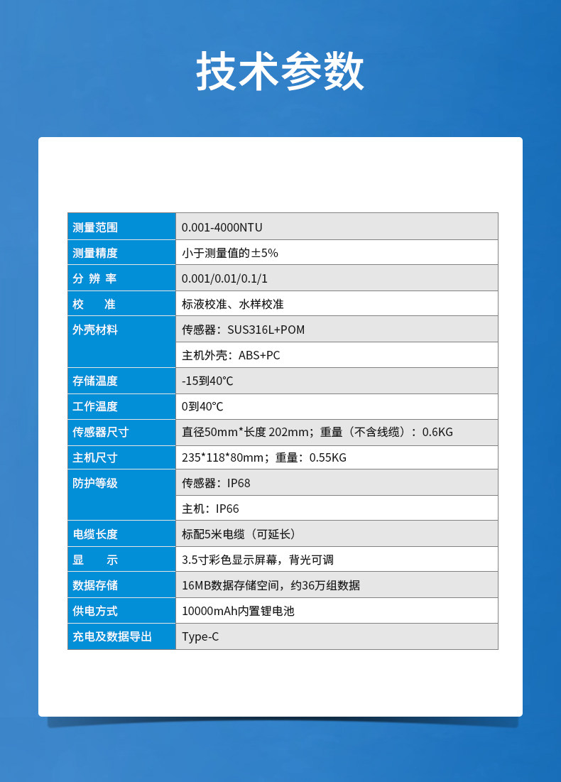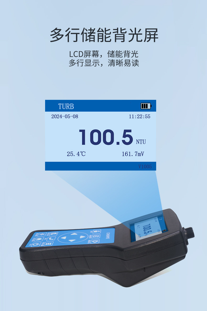 SC300TURB型便携式浊度分析仪由便携式仪器以及浊度传感器组成。采用先进的散射法测定原理,基本无需保养,测量结果具有良好的重复性及稳定性。仪器IP66防护等级,人体工学曲线设计,适于手握操作,在潮湿环境中容易掌握,出厂校准,一年无需校准,可现场校准;数字化传感器,现场使用方便、快捷,和仪器实现即插即用。带有Type-C接口, 可以实现对内置电池充电,并可通过Type-C接口实现数据导出。广泛应用于水产养殖、污水处理、地表水、工农业给排水、生活用水、锅炉水质、科研高校等行业和领域浊度的现场便携式监测。