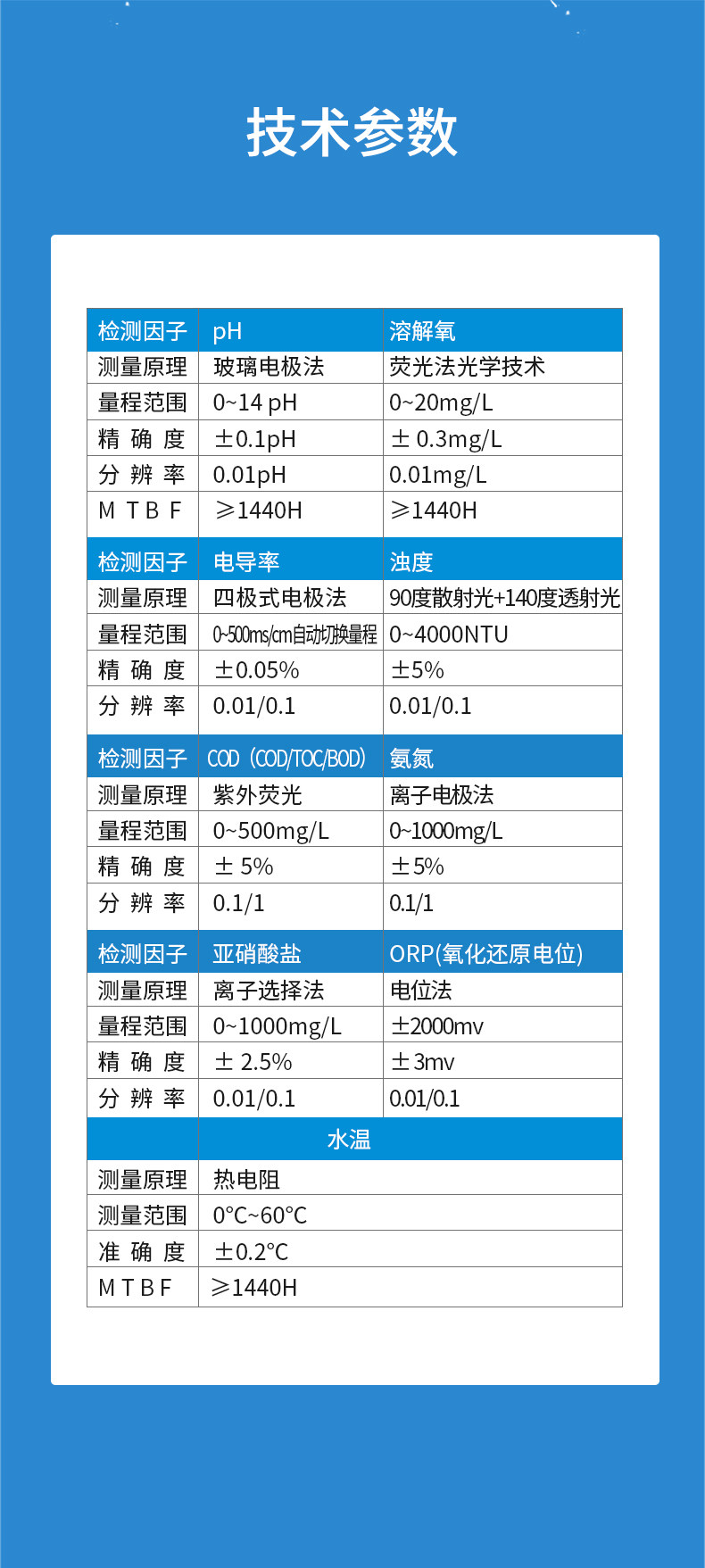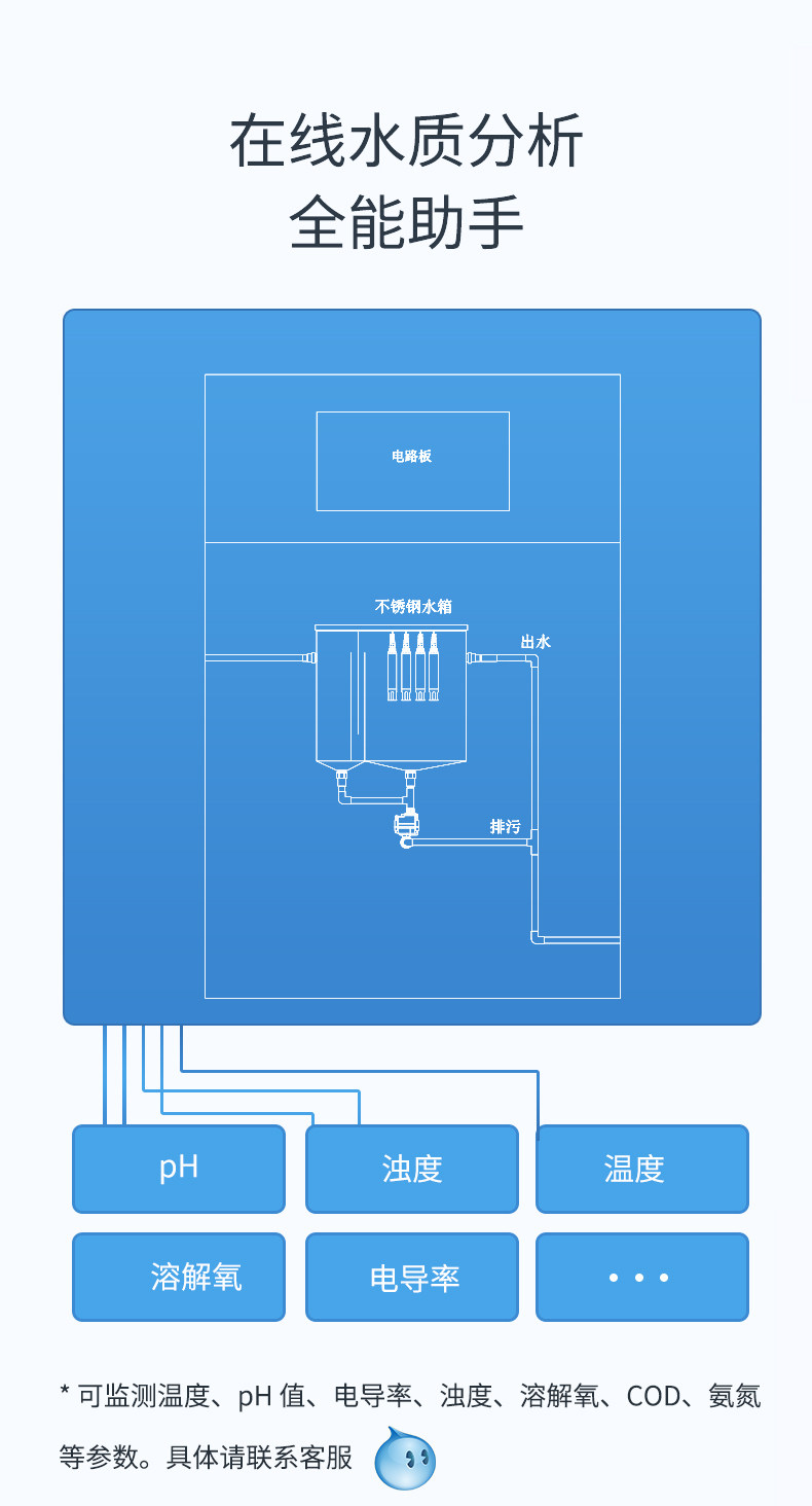 微型水质监测站基于光学、电化学等测量原理,可监测温度、pH值、电导率、浊度、悬浮物、溶解氧、COD、氨氮、色度、叶绿素、蓝绿藻、硝酸盐、亚硝酸盐等参数。